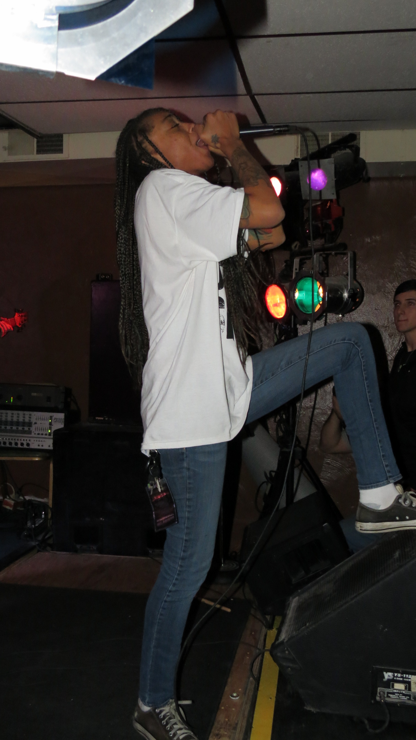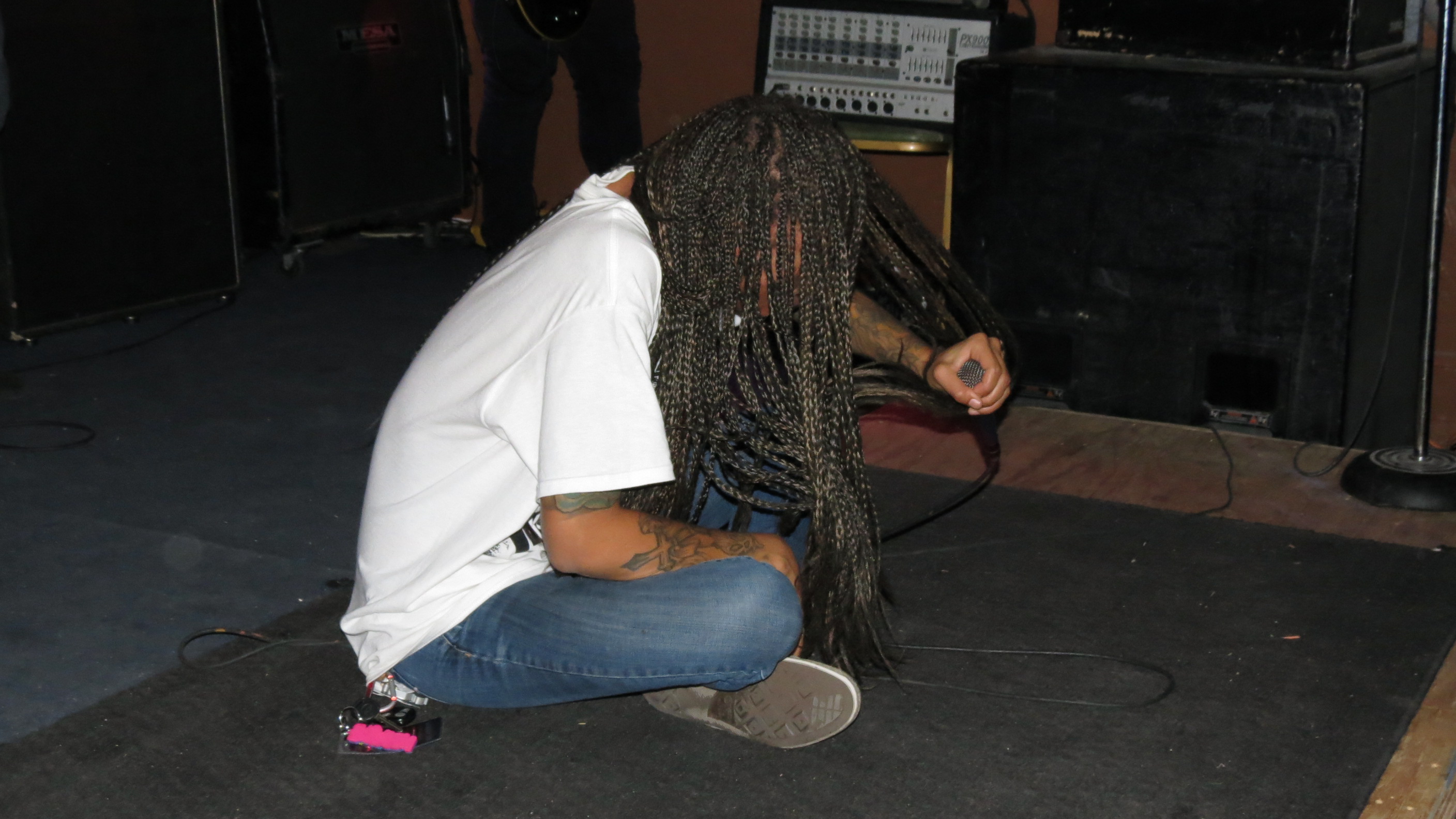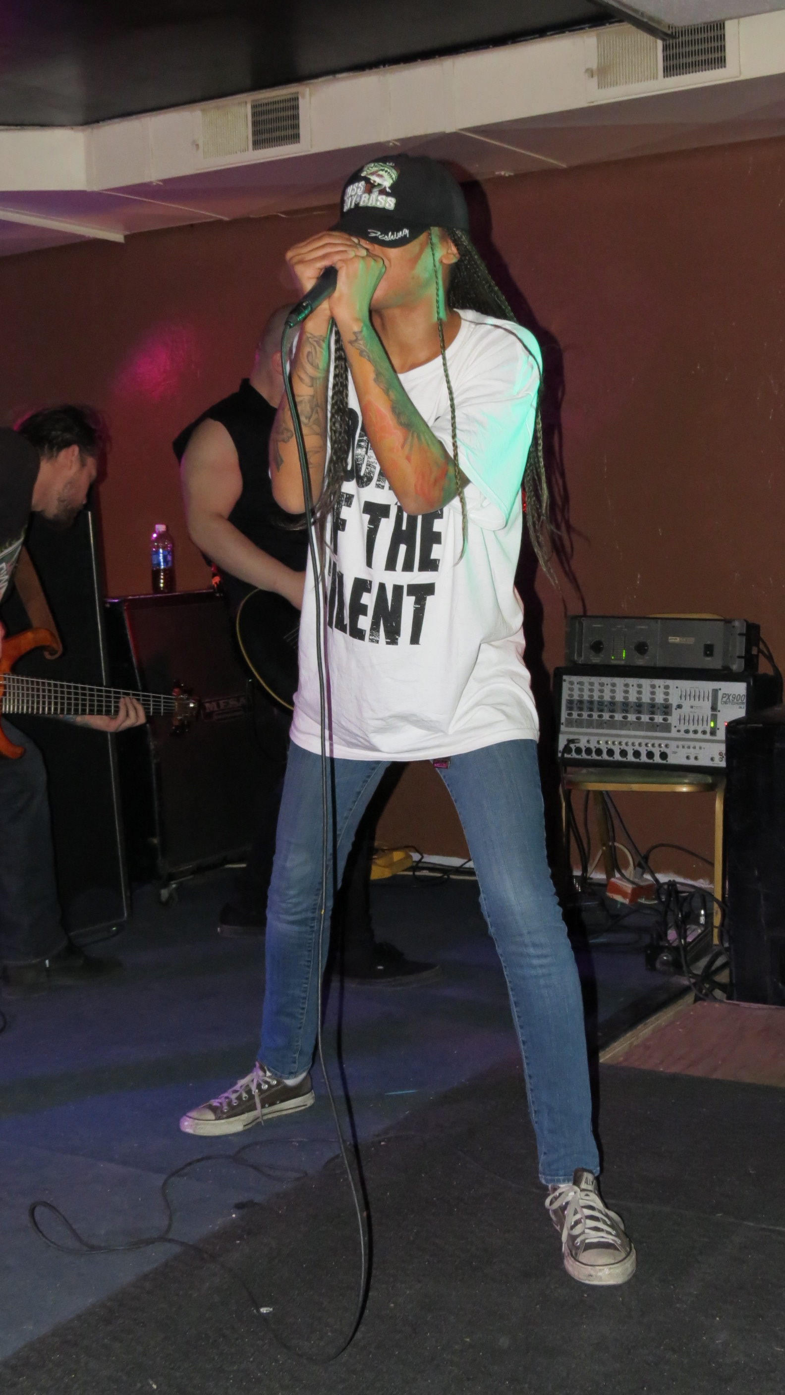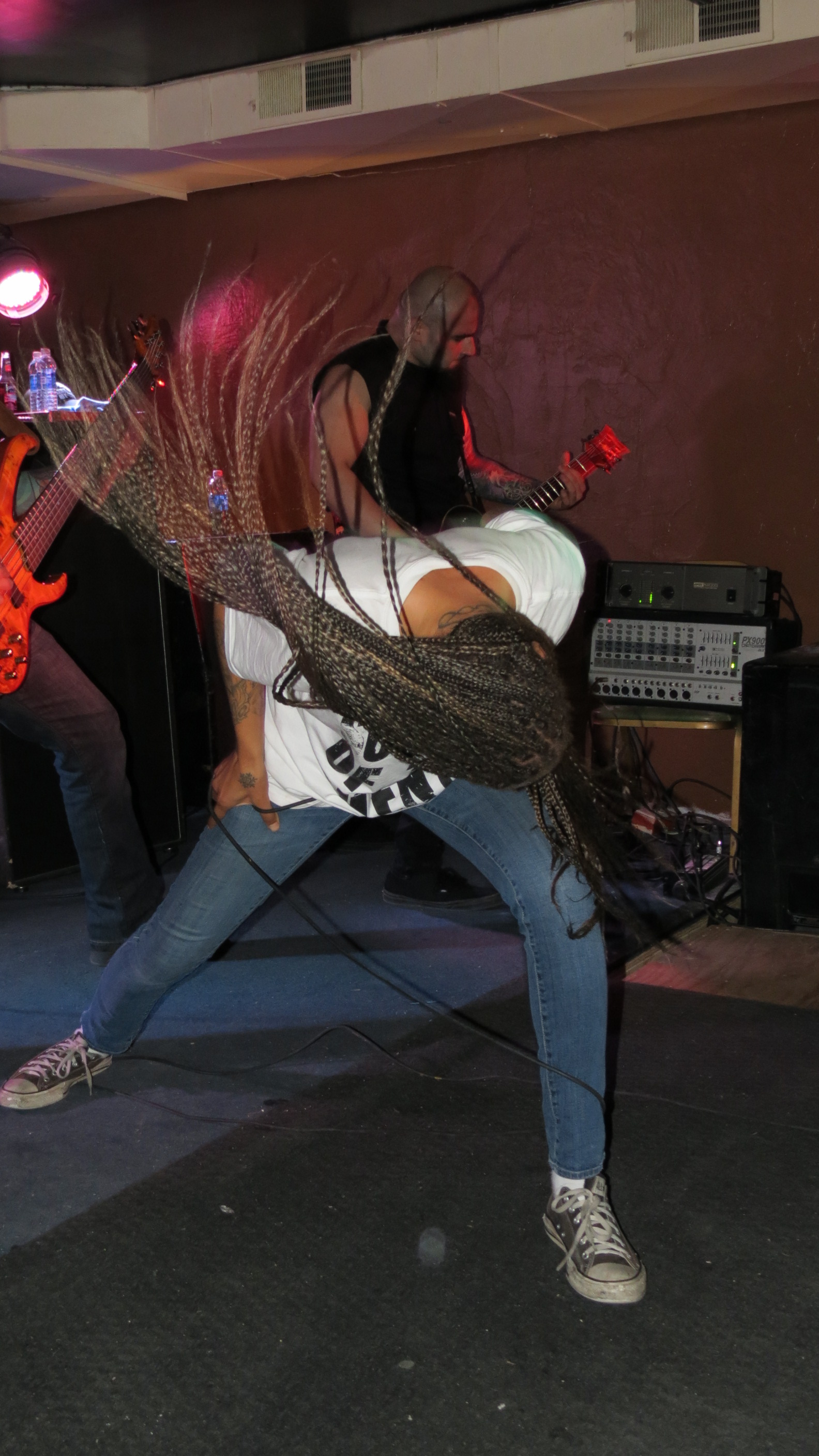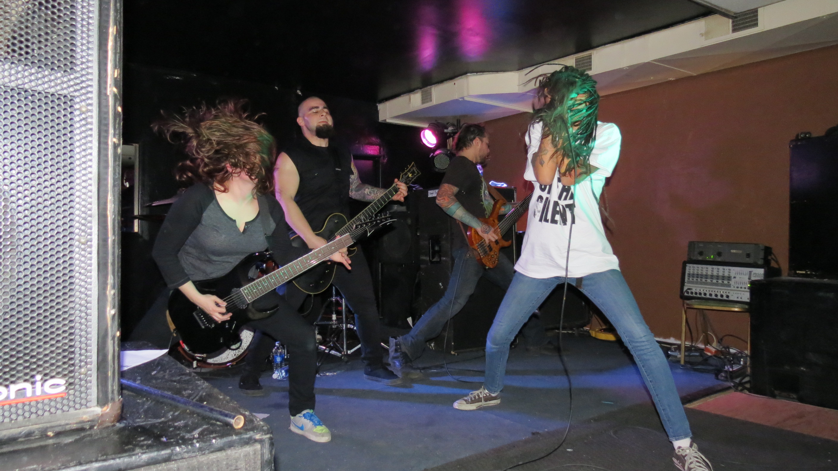 For someone who is not familiar with the Knoxville band Straight Line Stitch, they would be amazed to know that the soft-spoken, petite woman sitting at their merch table early in the evening would transform completely the moment she hit the stage at the Dead Horse Cantina in McKees Rocks on December 19. Alexis Brown releases guttural growls comparable with some of the best male metal vocalists then transitions seamlessly into soaring melodies. They did not disappoint and they tore through their set with ferocity, Alexis jumping and swinging her waist-length braids and the rest of the band rocking with intensity. The band was amazing in a club setting and has a great on-stage chemistry.